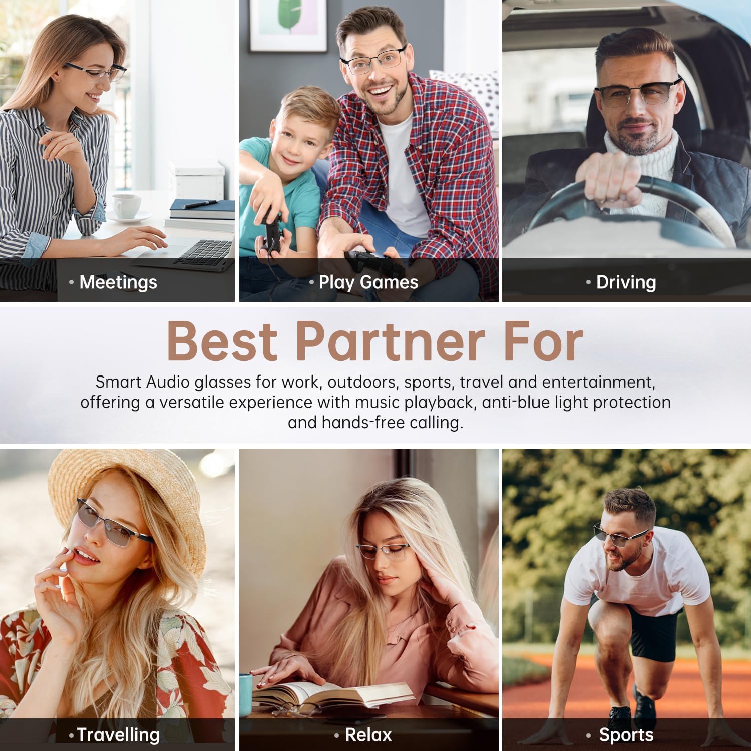- ใOpen-ear Headphones Glassesใ: Our bluetooth glasses are designed with open dual speakers, using independent audio decoder chip + AAC speaker technology to ensure sound quality and high quality sound for calls, the clear sound quality gives you a different open-ended experience.