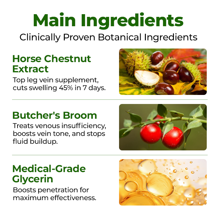Horse Chestnut Extract: The only widely accepted supplement for leg vein symptoms. Reduces swelling and inflammation by up to 45% within 7 days.